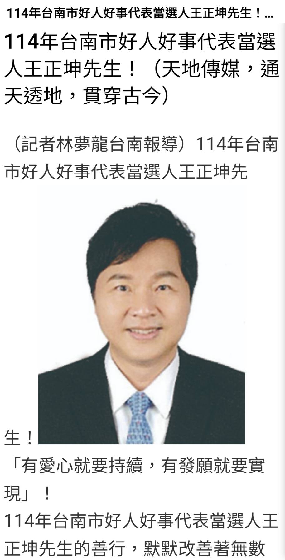 2025/09/11 恭喜王正坤醫師(理事長)當選114年臺南市好人好事代表。王正坤醫師帶著藝群眼睛來行善! 恭喜王正坤醫師(理事長)當選 114年臺南市好人好事代表 https://tdns.net.tw/news_view.php?new_sn=99656 王正坤醫師帶著藝群眼睛來行善! ---------------- 114年台南市好人好事代表當選人王正坤先生!(天地傳媒,通天透地,貫穿古今) (記者林夢龍台南報導)114年台南...