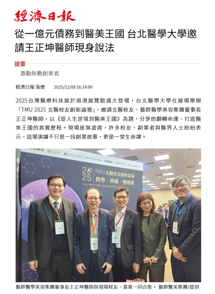 2025/12/09 從一億元債務到醫美王國 台北醫學大學邀請王正坤醫師現身說法 激勵無數創業者 -經濟日報 從一億元債務到醫美王國 台北醫學大學邀請王正坤醫師現身說法 激勵無數創業者 -經濟日報 提要 激勵無數創業者 https://money.udn.com/money/story/5635/9190352 經濟日報 張傑2025/12/08 16:14:00 經濟日報I商情I熱門亮點 2025台灣醫療科技展於南港展覽館盛大登場,台北醫學大學...