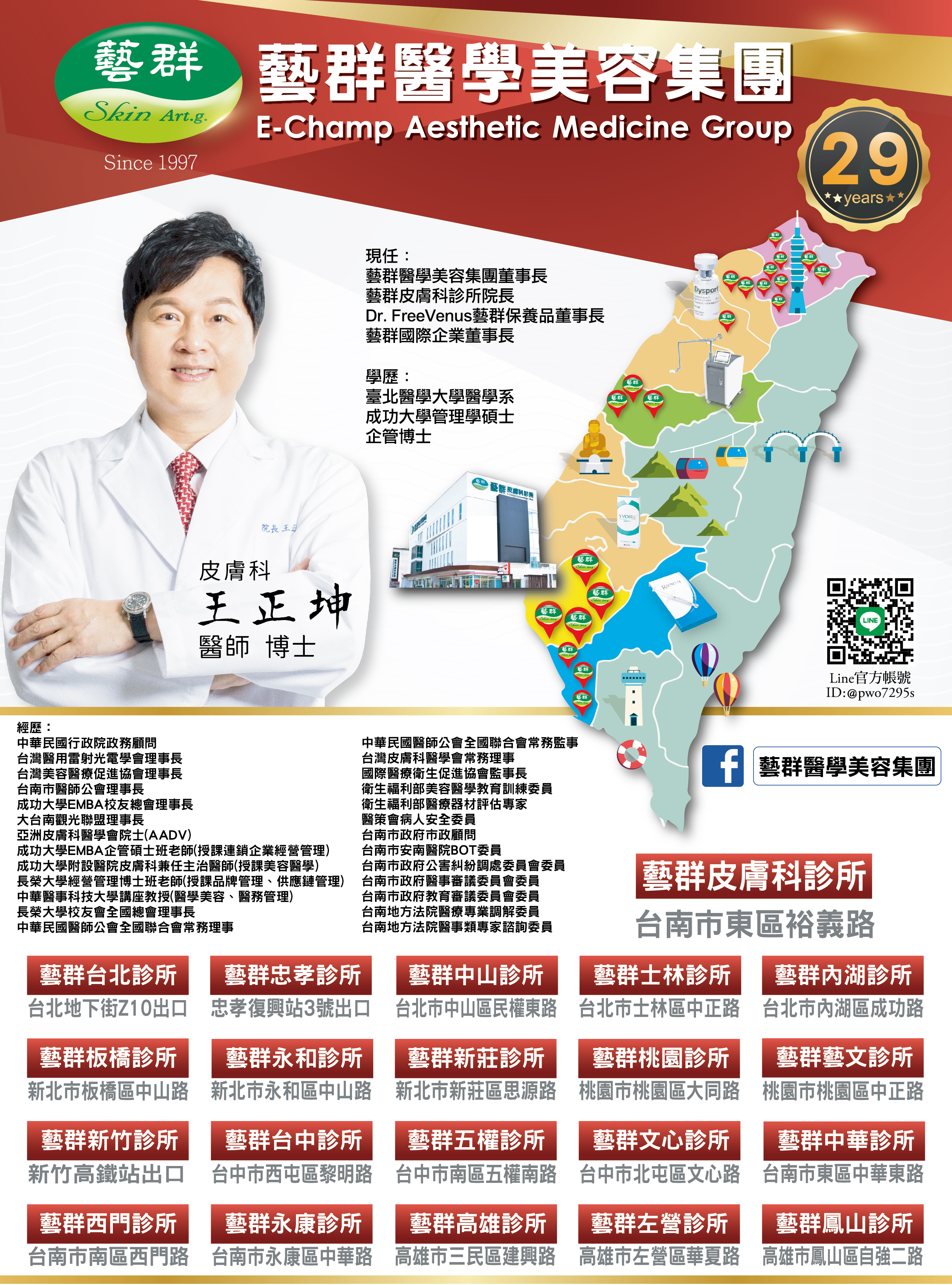 「藝群醫學美容集團」董事長王正坤醫師長年深耕醫學美容產業,始終隱身在每個營運細節之中。他不僅連任三屆台南市醫師公會理事長,更擔任台灣美容醫療促進協會理事長、中華民國醫用雷射光電學會理事長,並榮獲行政院顧問殊榮。王醫師深信:「機會是留給準備好的人。」