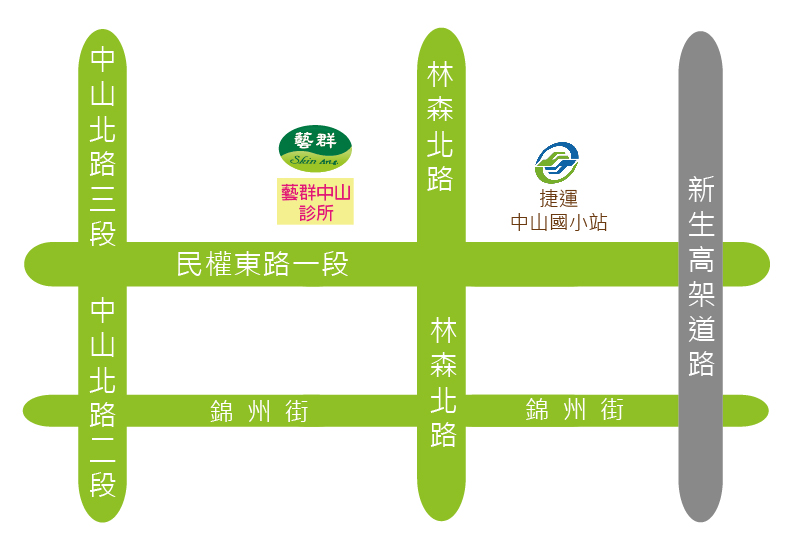 1. 搭乘台北捷運(中和新蘆線)至中山國小站下車,由1號出口走出,沿民權東路,朝中山北路方向直行100公尺。