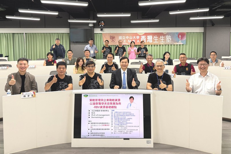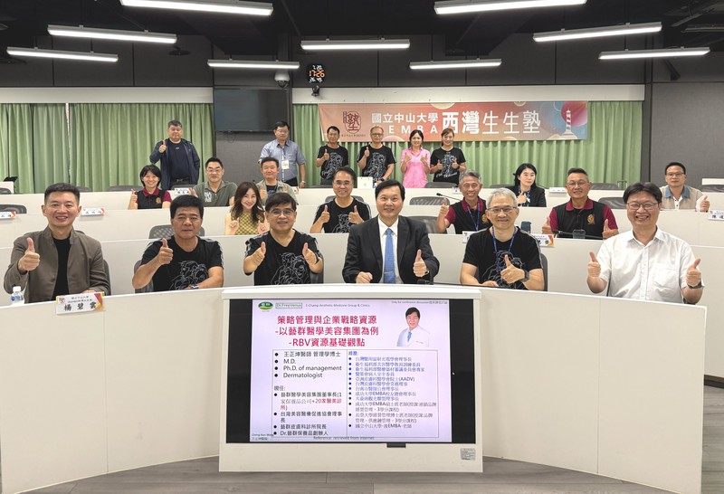 國立中山大學管理學院「後EMBA-西灣生生塾」課程於7月20日下午舉辦專題講座,特別邀請藝群醫學美容集團董事長王正坤醫師,授課「策略管理與企業戰略資源-如何開設21家連鎖診所」。向來自全台各地、具備企業管理經驗的EMBA校友,深入分享企業如何透過核心資源優勢實現快速展店與穩定經營。講座由鄭安授老師主持,並由中山大學管理學院林豪傑院長頒發感謝狀,感謝王正坤醫師嘉惠學子的精彩課程。