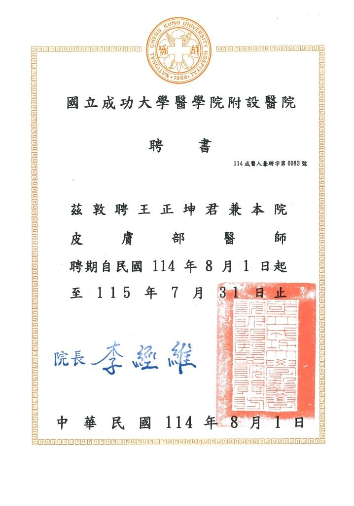 國立成功大學醫學院附設醫院 聘書 茲敦聘王正坤醫師 兼本院皮膚部醫師 114成醫人兼聘字第0083號