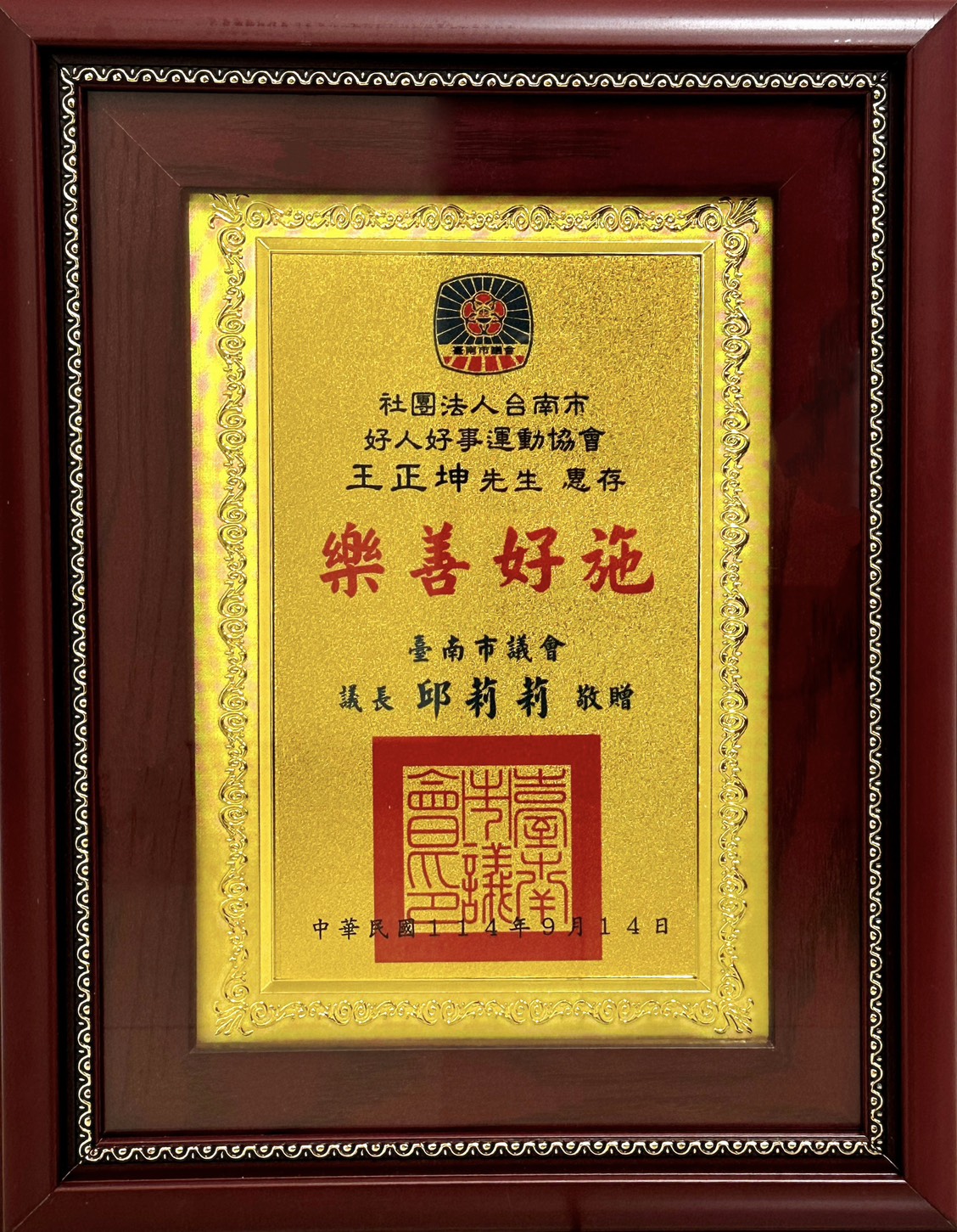 王政坤醫師 當選114台南好人好事代表-南好協(114)好人好事證字第01號