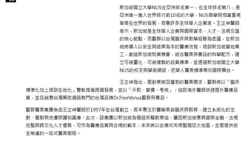 新加坡國立大學NUS在亞洲排名第一,在全球排名第八,是亞洲唯一進入世界排行前10名的大學,NUS商學院相當重視華商在世界的發展,培養許多全球華人企業家。王正坤醫師表示,新加坡是全球華人企業與國際資本、人才、法規交匯的核心節點,而藝群以台灣臨床與教學經驗為底蘊,在新加坡將導入以安全與結果為本的醫療流程,培訓新加坡當地員工,創造新加坡就業機會,結合醫美保養品的科學配方,建立可被量化、可被複製的品質標準,並透過新加坡國立大學NUS的校友與學術網絡,把華人醫美標準帶向國際舞台。