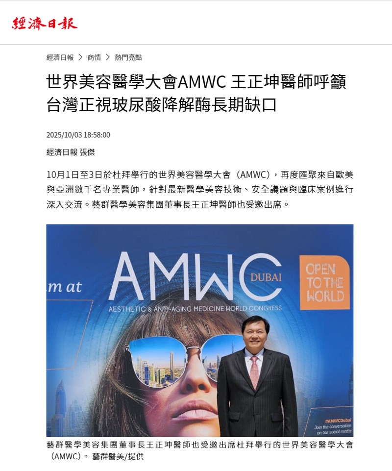 世界美容醫學大會AMWC 王正坤醫師呼籲台灣正視玻尿酸降解酶長期缺口-經濟日報