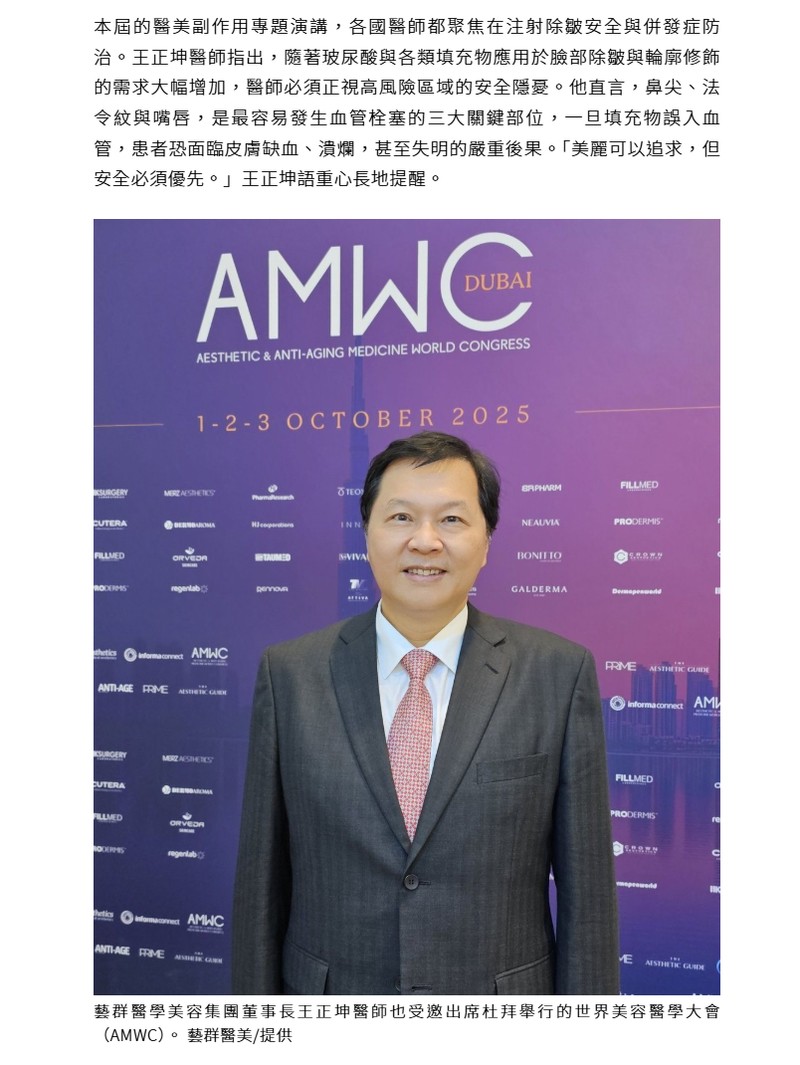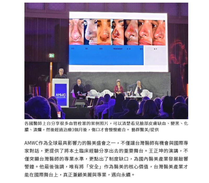 AMWC作為全球最具影響力的醫美盛會之一,不僅讓台灣醫師有機會與國際專家對話,更提供了將本土臨床經驗分享出去的重要舞台。王正坤的演講,不僅突顯台灣醫師的專業水準,更點出了制度缺口,為國內醫美產業發展敲響警鐘。他最後強調,唯有將「安全」作為醫美的核心價值,台灣醫美產業才能在國際舞台上,真正兼顧美麗與專業,邁向永續。