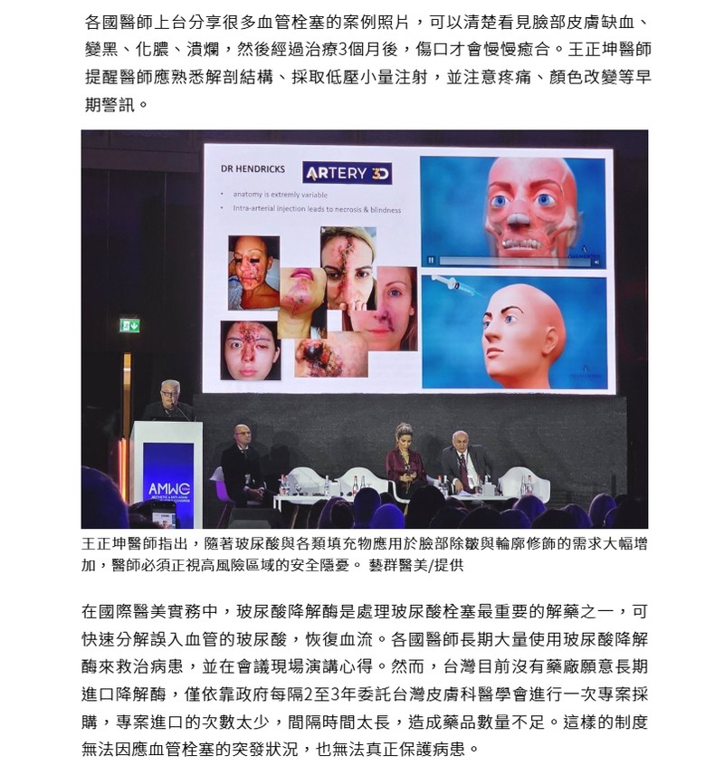 本屆的醫美副作用專題演講,各國醫師都聚焦在注射除皺安全與併發症防治。王正坤醫師指出,隨著玻尿酸與各類填充物應用於臉部除皺與輪廓修飾的需求大幅增加,醫師必須正視高風險區域的安全隱憂。他直言,鼻尖、法令紋與嘴唇,是最容易發生血管栓塞的三大關鍵部位,一旦填充物誤入血管,患者恐面臨皮膚缺血、潰爛,甚至失明的嚴重後果。「美麗可以追求,但安全必須優先。」王正坤語重心長地提醒。