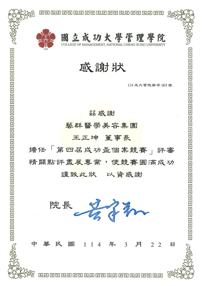 國立成功大學管理學院 感謝狀 茲感謝藝群醫學美容集團王正坤董事長 擔任「第四屆成功盃個案競賽」評審 114成大管院謝字003號