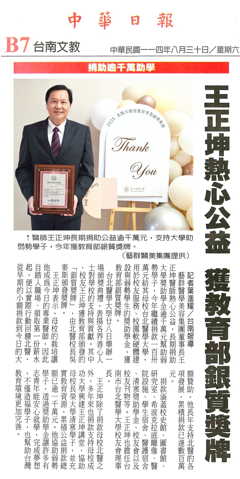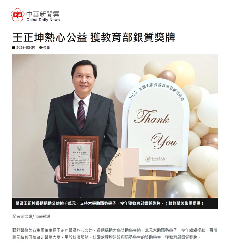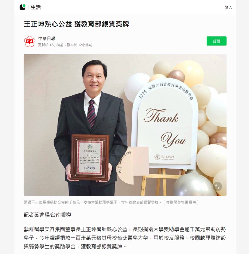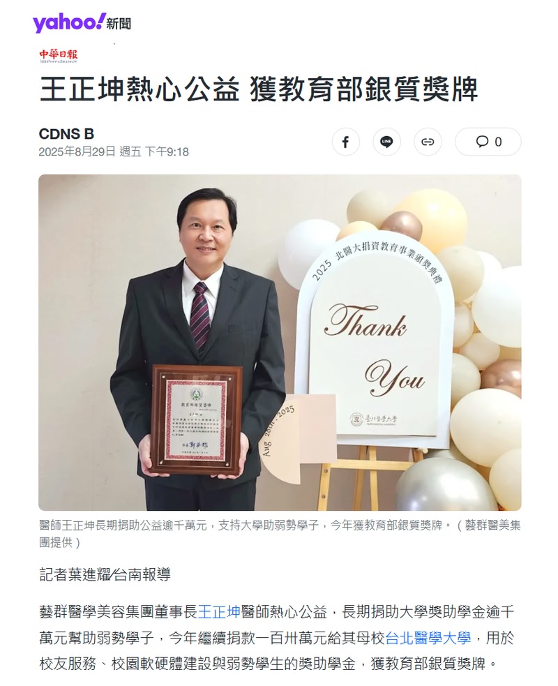 藝群醫學美容集團董事長王正坤醫師熱心公益,長期捐助大學獎助學金逾千萬元幫助弱勢學子,今年繼續捐款一百卅萬元給其母校台北醫學大學,用於校友服務、校園軟硬體建設與弱勢學生的獎助學金,獲教育部銀質獎牌。