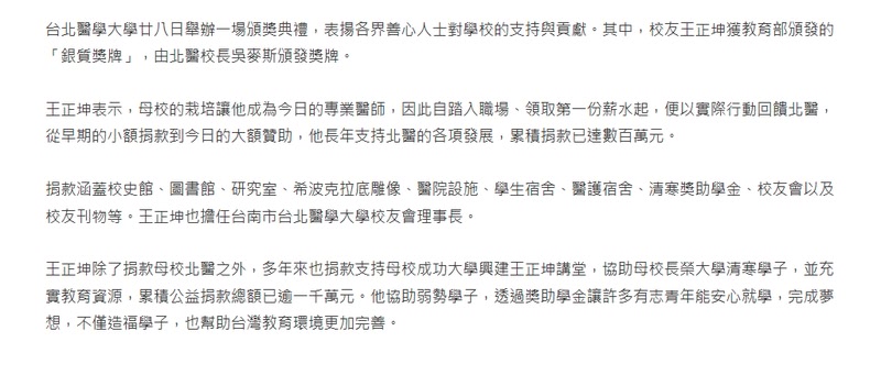 台北醫學大學廿八日舉辦一場頒獎典禮,表揚各界善心人士對學校的支持與貢獻。其中,校友王正坤獲教育部頒發的「銀質獎牌」,由北醫校長吳麥斯頒發獎牌。