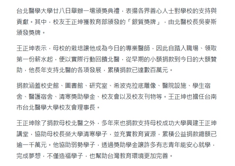 王正坤熱心公益 獲教育部銀質獎牌-捐助逾千萬助學 -Yahoo奇摩新聞-LINE TODAY-中華日報