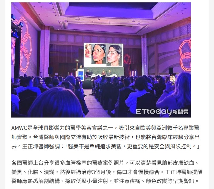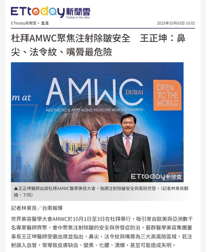 世界美容醫學大會AMWC於10月1日至3日在杜拜舉行,吸引來自歐美與亞洲數千名專業醫師齊聚,會中聚焦注射除皺的安全與併發症防治,藝群醫學美容集團董事長王正坤醫師受邀出席並指出,鼻尖、法令紋與嘴脣為三大高風險區域,若注射誤入血管,常導致皮膚缺血、變黑、化膿、潰爛,甚至可能造成失明。