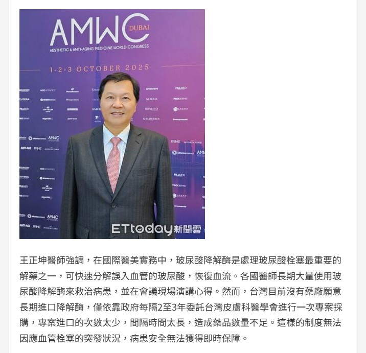 王正坤醫師強調,在國際醫美實務中,玻尿酸降解酶是處理玻尿酸栓塞最重要的解藥之一,可快速分解誤入血管的玻尿酸,恢復血流。各國醫師長期大量使用玻尿酸降解酶來救治病患,並在會議現場演講心得。然而,台灣目前沒有藥廠願意長期進口降解酶,僅依靠政府每隔2至3年委託台灣皮膚科醫學會進行一次專案採購,專案進口的次數太少,間隔時間太長,造成藥品數量不足。這樣的制度無法因應血管栓塞的突發狀況,病患安全無法獲得即時保障。
