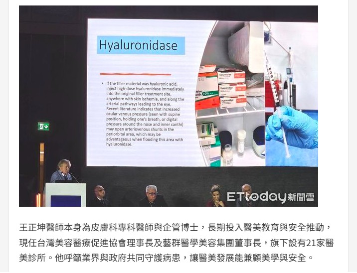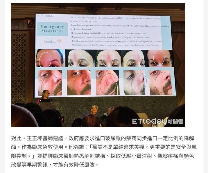 對此,王正坤醫師建議,政府應要求進口玻尿酸的藥商同步進口一定比例的降解酶,作為臨床急救使用。他強調:「醫美不是單純追求美觀,更重要的是安全與風險控制。」並提醒臨床醫師熟悉解剖結構、採取低壓小量注射、觀察疼痛與顏色改變等早期警訊,才能有效降低風險。