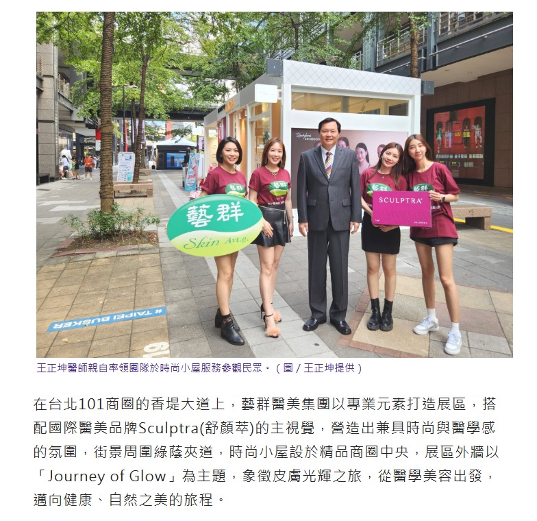 在台北101商圈的香堤大道上,藝群醫美集團以專業元素打造展區,搭配國際醫美品牌Sculptra(舒顏萃)的主視覺,營造出兼具時尚與醫學感的氛圍,街景周圍綠蔭夾道,時尚小屋設於精品商圈中央,展區外牆以「Journey of Glow」為主題,象徵皮膚光輝之旅,從醫學美容出發,邁向健康、自然之美的旅程。