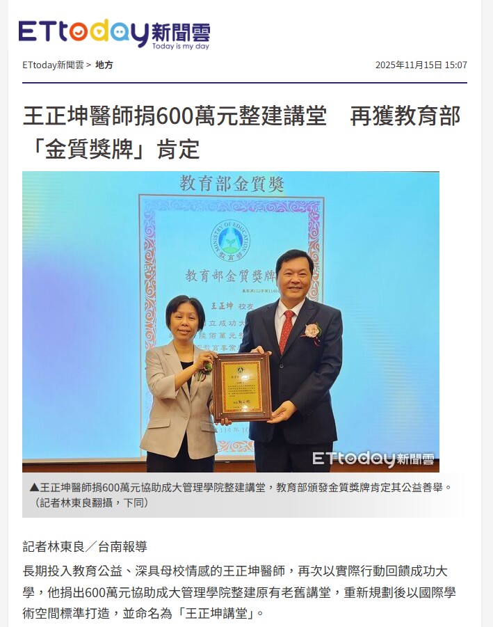 王正坤醫師捐600萬元整建講堂 再獲教育部「金質獎牌」肯定 -東森新聞雲-ETtoday新聞雲