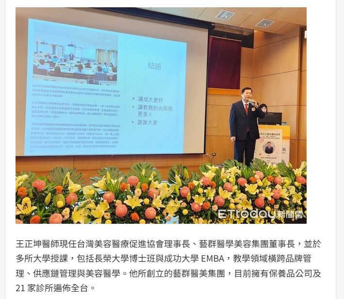王正坤醫師現任台灣美容醫療促進協會理事長、藝群醫學美容集團董事長,並於多所大學授課,包括長榮大學博士班與成功大學 EMBA,教學領域橫跨品牌管理、供應鏈管理與美容醫學。他所創立的藝群醫美集團,目前擁有保養品公司及 21 家診所遍佈全台。