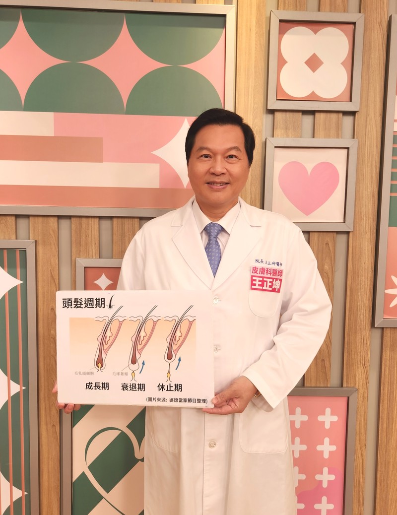 王正坤醫師首先為觀眾解釋毛髮的生理週期,包括生長期(Anagen)、衰退期(Catagen)與休止期(Telogen)。他指出,健康的頭髮大多處於生長期,能穩定增長;但若因荷爾蒙失調、壓力過大或營養不良導致生長期縮短、休止期延長,就會加速掉髮,進而產生禿頭問題。