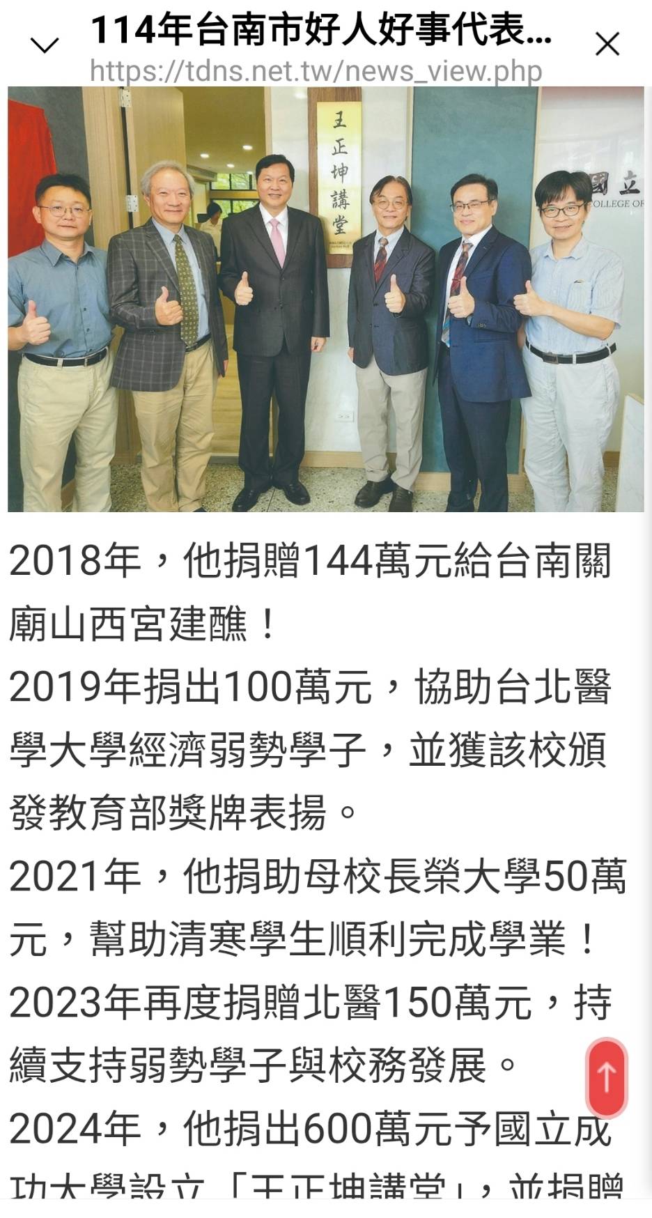 114年台南市好人好事代表當選人王正坤先生!(天地傳媒,通天透地,貫穿古今)