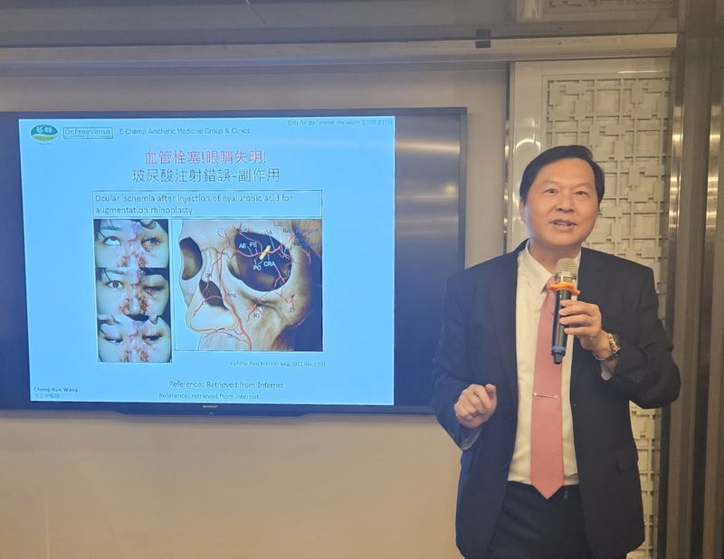 愛盲協會除了照顧視障者,也肩負健康教育與公益使命,這幾年來,常常有患者注射玻尿酸導致眼睛失明的事件發生,愛盲協會很關注這個問題。王正坤醫師剛好是2023年英國醫學美容教科書的作者,書名「A Guide to Aesthetic Medicine and Cosmetic Surgery美容醫學和整形手術指南」。王正坤醫師表示,注射在臉上凹陷皺紋的填充物包含玻尿酸、膠原蛋白、膠原蛋白增生劑、舒顏萃(Sculptra)、艾麗斯(Aesthefill)、喬雅露(Juvelook)、薇貝拉(Vivabella)、非交聯玻尿酸、晶亮瓷瑞得喜(Radiesse)、洢蓮絲(Ellanse)等,這些填充物只要被注射進入血管,就會導致血管栓塞。醫美注射導致失明的患者,通常都是因為中央視網膜動脈(CRA)被栓塞。在剛剛發生血管阻塞的90分鐘之內,必須緊急打通中央視網膜動脈,否則會造成視網膜壞死與永久失明。