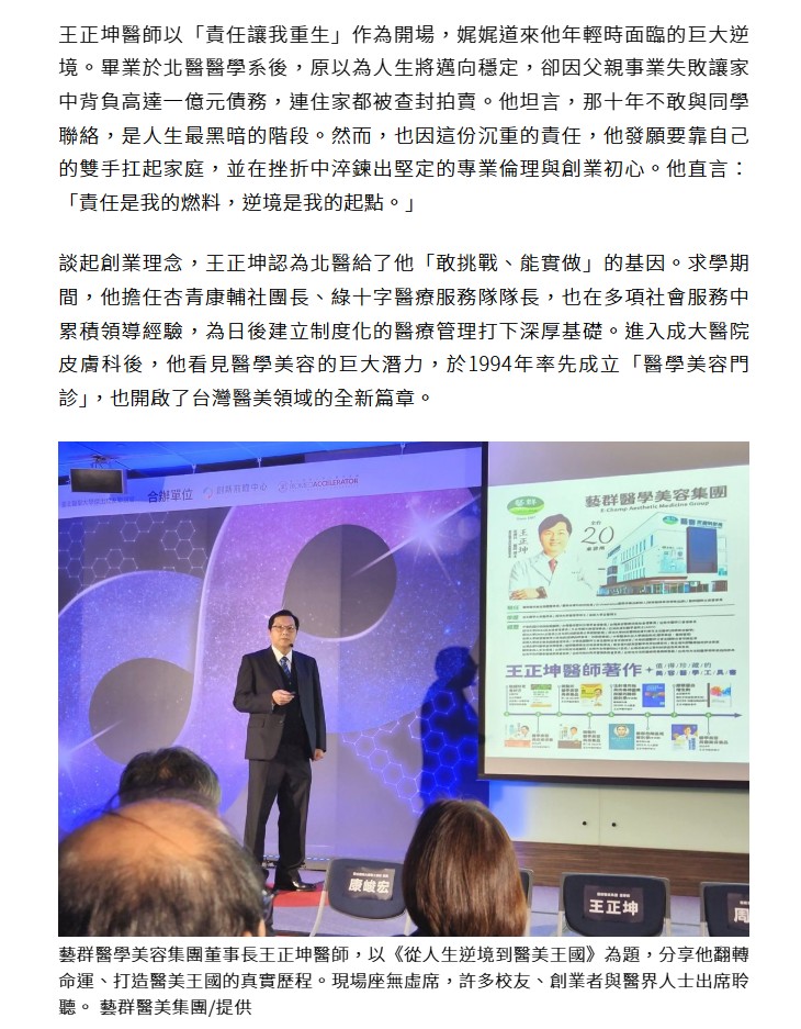 從一億元債務到醫美王國 台北醫學大學邀請王正坤醫師現身說法 激勵無數創業者 -經濟日報