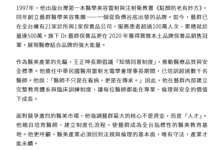 作為醫美產業的先驅,王正坤長期倡議「知情同意制度」,推動醫療品質與安全標準。他擔任中華民國醫用雷射光電學會理事長期間,已培訓超過數千名醫師。他說:「醫師不只是在看病,更是在傳承。」因此,他在藝群內部建立完整教育體系與臨床訓練制度,讓每位醫師都能在專業、倫理與安全的價值下成長。