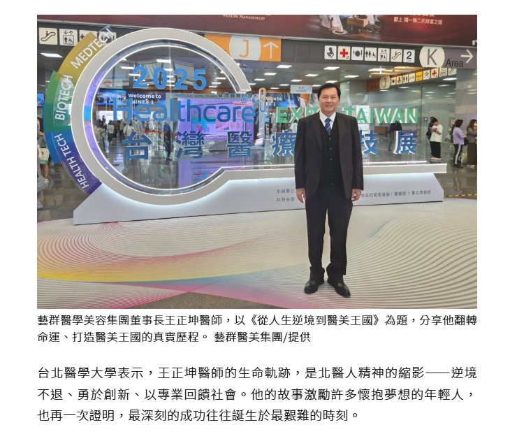 2025台灣醫療科技展於南港展覽館盛大登場,台北醫學大學在展場舉辦「TMU 2025 北醫校友創新論壇」,邀請北醫校友、藝群醫學美容集團董事長王正坤醫師,以《從人生逆境到醫美王國》為題,分享他翻轉命運、打造醫美王國的真實歷程。現場座無虛席,許多校友、創業者與醫界人士紛紛表示,這場演講不只是一段創業故事,更是一堂生命課。