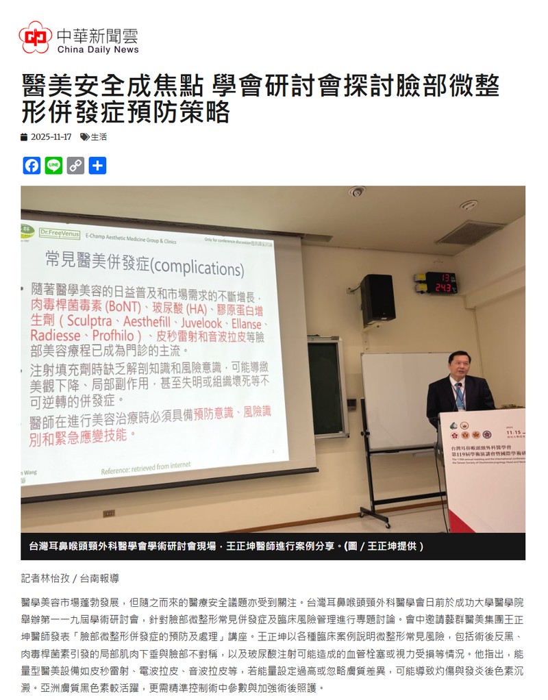 醫學美容市場蓬勃發展,但隨之而來的醫療安全議題亦受到關注。台灣耳鼻喉頭頸外科醫學會日前於成功大學醫學院舉辦第一一九屆學術研討會,針對臉部微整形常見併發症及臨床風險管理進行專題討論。會中邀請藝群醫美集團王正坤醫師發表「臉部微整形併發症的預防及處理」講座。王正坤以各種臨床案例說明微整形常見風險,包括術後反黑、肉毒桿菌素引發的局部肌肉下垂與臉部不對稱,以及玻尿酸注射可能造成的血管栓塞或視力受損等情況。他指出,能量型醫美設備如皮秒雷射、電波拉皮、音波拉皮等,若能量設定過高或忽略膚質差異,可能導致灼傷與發炎後色素沉澱。亞洲膚質黑色素較活躍,更需精準控制術中參數與加強術後照護。