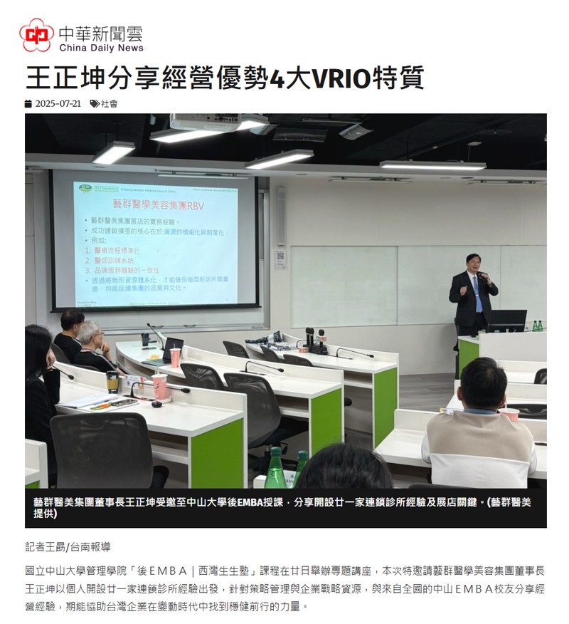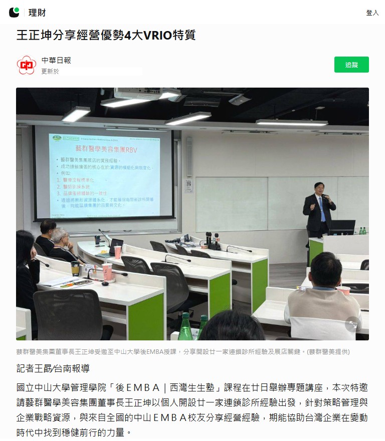 藝群醫美集團董事長王正坤受邀至中山大學後EMBA授課,分享開設廿一家連鎖診所經驗及展店關鍵。