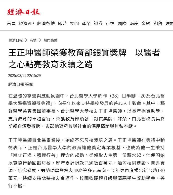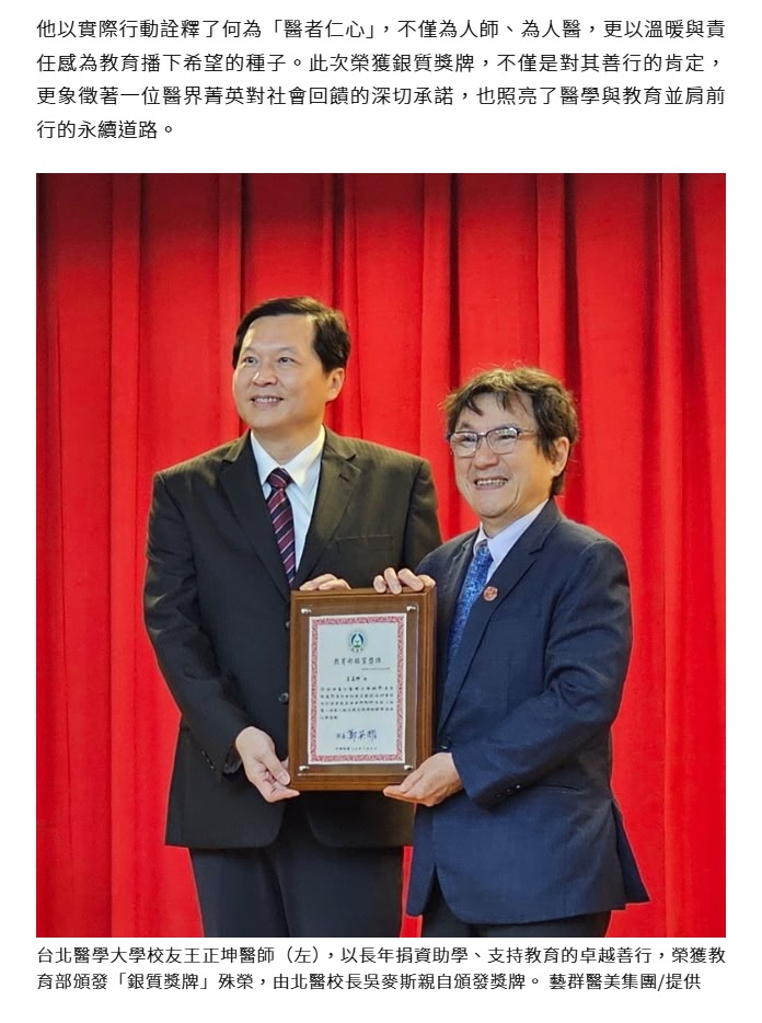 王正坤醫師榮獲教育部銀質獎牌 以醫者之心點亮教育永續之路 -經濟日報