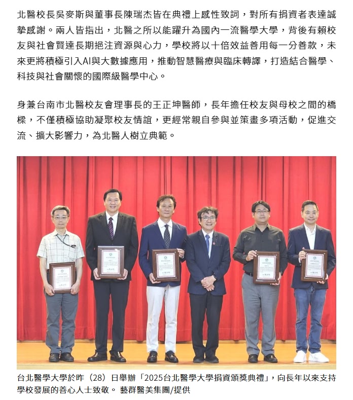 在溫暖的掌聲與感動氛圍中,台北醫學大學於昨(28)日舉辦「2025台北醫學大學捐資頒獎典禮」,向長年以來支持學校發展的善心人士致敬。其中,藝群醫學美容集團董事長、台北醫學大學校友王正坤醫師,以長年捐資助學、支持教育的卓越善行,榮獲教育部頒發「銀質獎牌」殊榮,由北醫校長吳麥斯親自頒發獎牌,表彰他對母校與社會的深厚情誼與無私奉獻。
