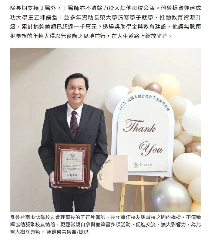 除長期支持北醫外,王醫師亦不遺餘力投入其他母校公益。他曾捐資興建成功大學王正坤講堂,並多年資助長榮大學清寒學子就學,推動教育資源升級,累計捐款總額已超過一千萬元。透過獎助學金與教育建設,他讓無數懷抱夢想的年輕人得以無後顧之憂地前行,在人生道路上綻放光芒。