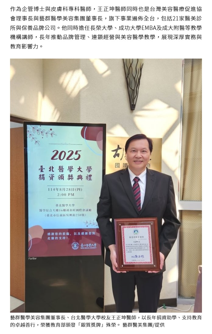 作為企管博士與皮膚科專科醫師,王正坤醫師同時也是台灣美容醫療促進協會理事長與藝群醫學美容集團董事長,旗下事業遍佈全台,包括21家醫美診所與保養品牌公司。他同時擔任長榮大學、成功大學EMBA及成大附醫等教學機構講師,長年推動品牌管理、連鎖經營與美容醫學教學,展現深厚實務與教育影響力。