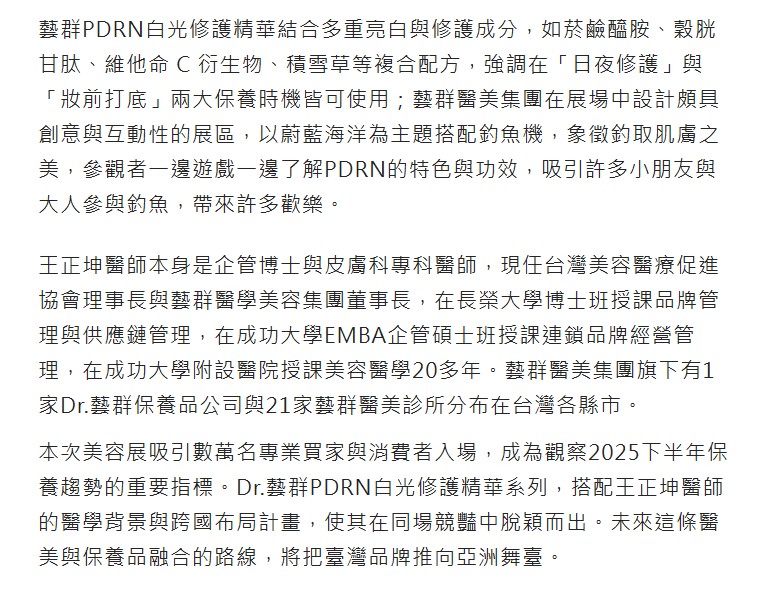 本次美容展吸引數萬名專業買家與消費者入場,成為觀察2025下半年保養趨勢的重要指標。Dr.藝群PDRN白光修護精華系列,搭配王正坤醫師的醫學背景與跨國布局計畫,使其在同場競豔中脫穎而出。未來這條醫美與保養品融合的路線,將把臺灣品牌推向亞洲舞臺。