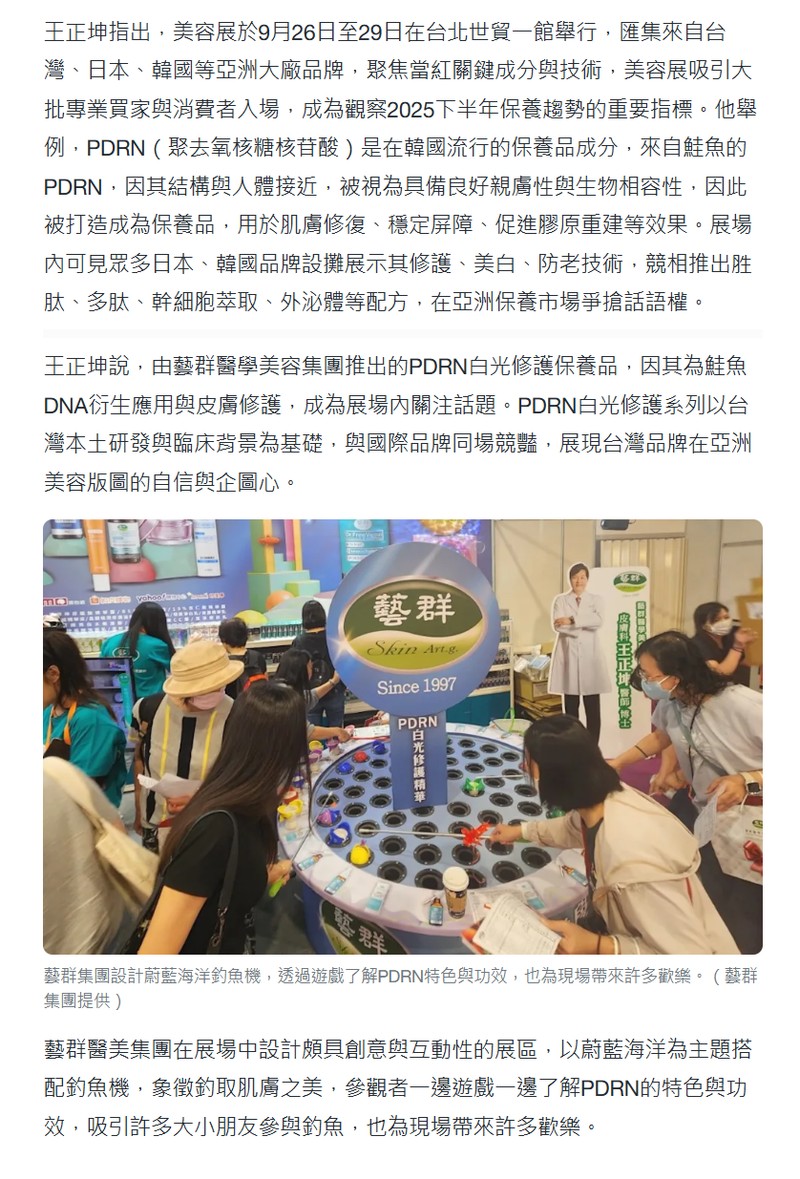 王正坤說,由藝群醫學美容集團推出的PDRN白光修護保養品,因其為鮭魚DNA衍生應用與皮膚修護,成為展場內關注話題。PDRN白光修護系列以台灣本土研發與臨床背景為基礎,與國際品牌同場競豔,展現台灣品牌在亞洲美容版圖的自信與企圖心。