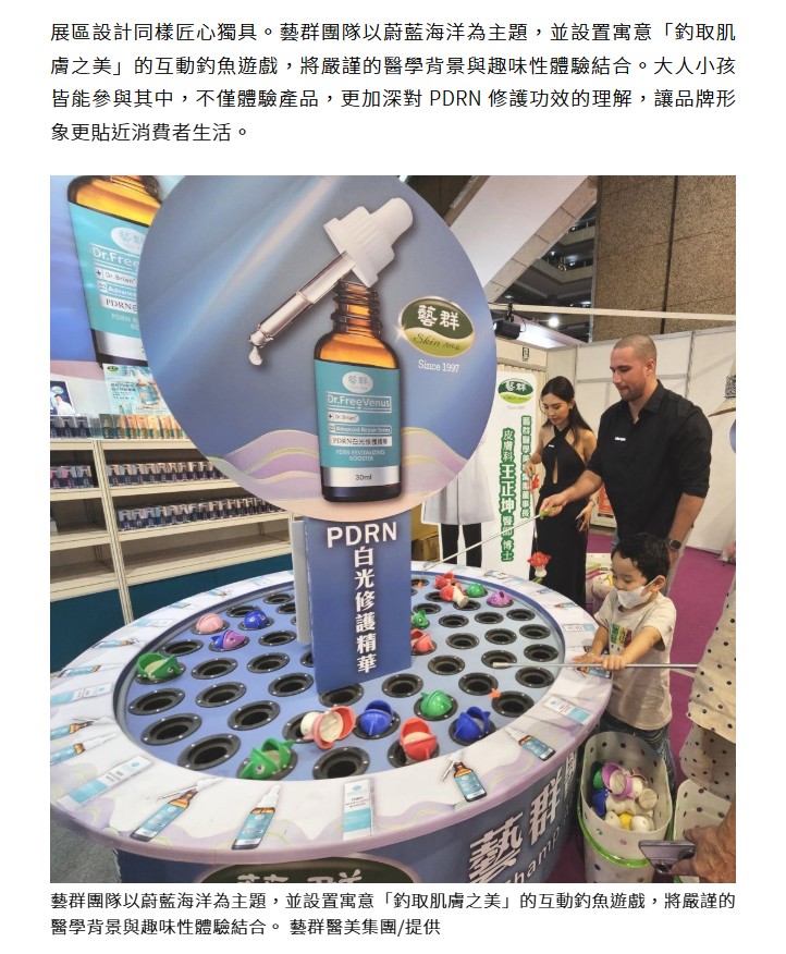 展區設計同樣匠心獨具。藝群團隊以蔚藍海洋為主題,並設置寓意「釣取肌膚之美」的互動釣魚遊戲,將嚴謹的醫學背景與趣味性體驗結合。大人小孩皆能參與其中,不僅體驗產品,更加深對 PDRN 修護功效的理解,讓品牌形象更貼近消費者生活。