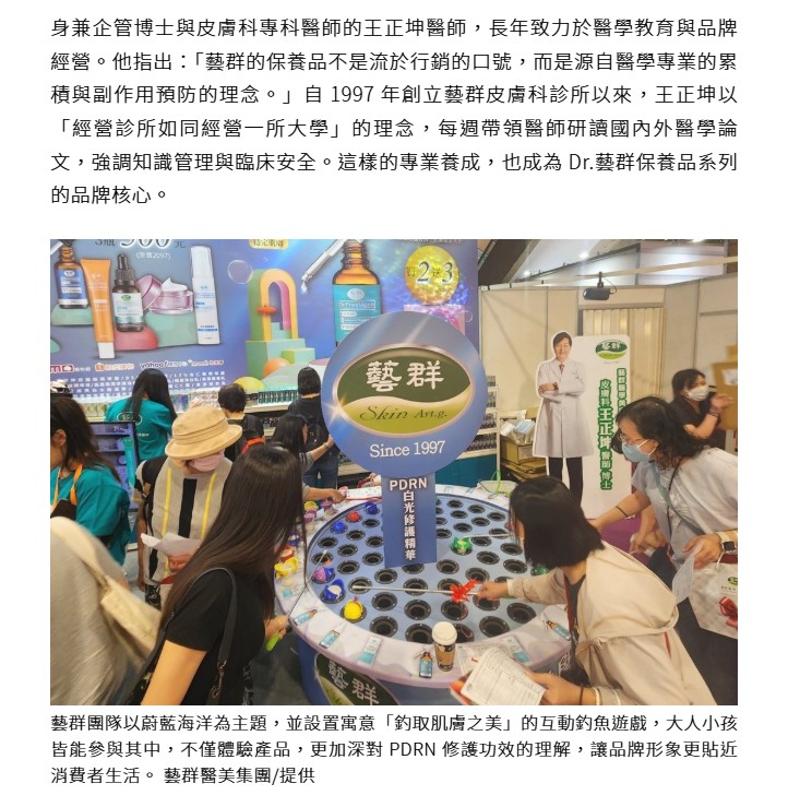 身兼企管博士與皮膚科專科醫師的王正坤醫師,長年致力於醫學教育與品牌經營。他指出:「藝群的保養品不是流於行銷的口號,而是源自醫學專業的累積與副作用預防的理念。」自 1997 年創立藝群皮膚科診所以來,王正坤以「經營診所如同經營一所大學」的理念,每週帶領醫師研讀國內外醫學論文,強調知識管理與臨床安全。這樣的專業養成,也成為 Dr.藝群保養品系列的品牌核心。