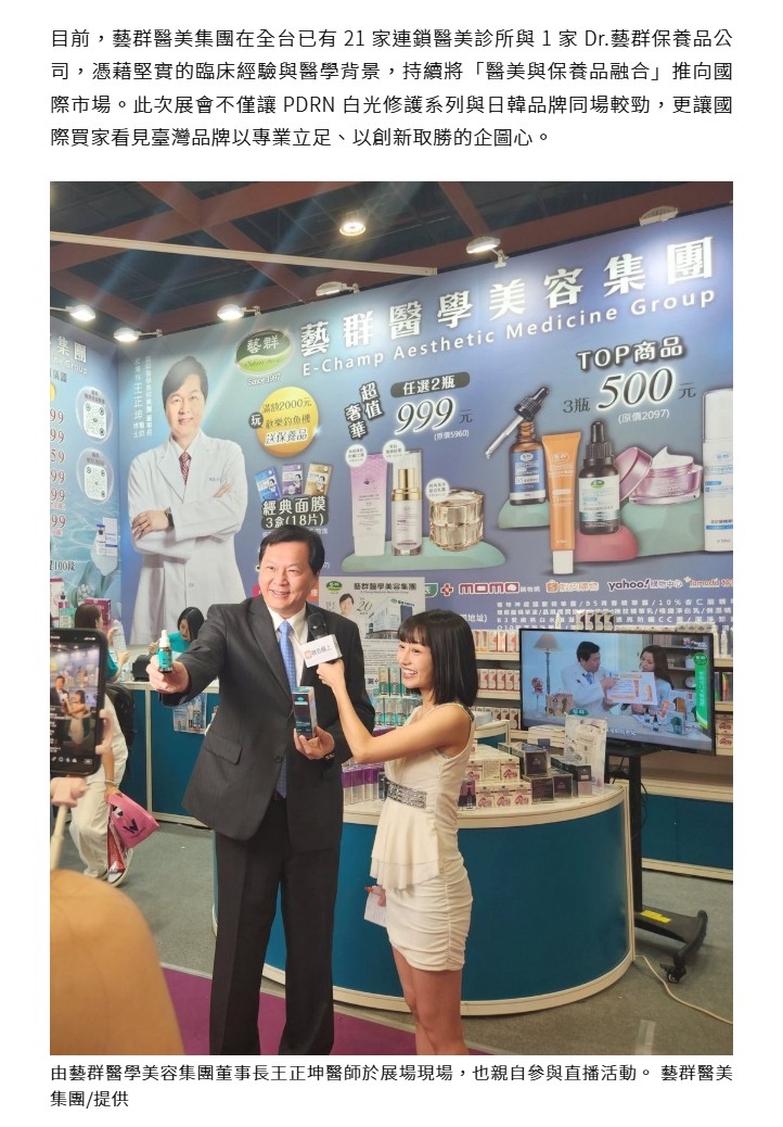 目前,藝群醫美集團在全台已有 21 家連鎖醫美診所與 1 家 Dr.藝群保養品公司,憑藉堅實的臨床經驗與醫學背景,持續將「醫美與保養品融合」推向國際市場。此次展會不僅讓 PDRN 白光修護系列與日韓品牌同場較勁,更讓國際買家看見臺灣品牌以專業立足、以創新取勝的企圖心。