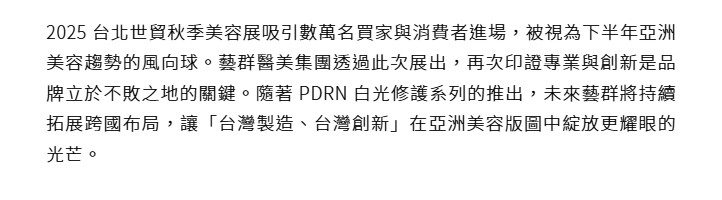 2025 台北世貿秋季美容展吸引數萬名買家與消費者進場,被視為下半年亞洲美容趨勢的風向球。藝群醫美集團透過此次展出,再次印證專業與創新是品牌立於不敗之地的關鍵。隨著 PDRN 白光修護系列的推出,未來藝群將持續拓展跨國布局,讓「台灣製造、台灣創新」在亞洲美容版圖中綻放更耀眼的光芒。