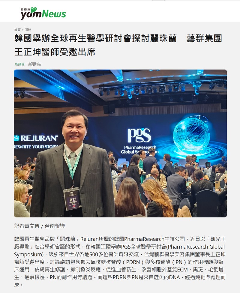 韓國再生醫學品牌「麗珠蘭」Rejuran所屬的韓國PharmaResearch生技公司,近日以「觀光工廠導覽」結合學術會議的形式,在韓國江陵舉辦PGS全球醫學研討會(PharmaResearch Global Symposium),吸引來自世界各地500多位醫師齊聚交流,台灣藝群醫學美容集團董事長王正坤醫師受邀出席,討論議題包含聚去氧核糖核苷酸(PDRN)與多核苷酸(PN)的作用機轉與臨床運用、皮膚再生修護、抑制發炎反應、促進血管新生、改善細胞外基質ECM、黑斑、毛髮增生、疤痕修護、PN的副作用等議題。而這些PDRN與PN是來自鮭魚的DNA,經過純化與處理而成。