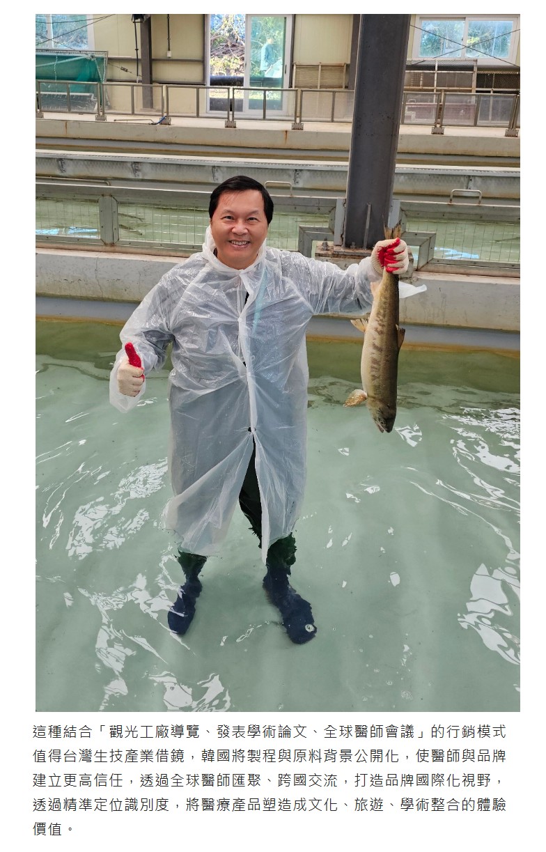 這種結合「觀光工廠導覽、發表學術論文、全球醫師會議」的行銷模式值得台灣生技產業借鏡,韓國將製程與原料背景公開化,使醫師與品牌建立更高信任,透過全球醫師匯聚、跨國交流,打造品牌國際化視野,透過精準定位識別度,將醫療產品塑造成文化、旅遊、學術整合的體驗價值。