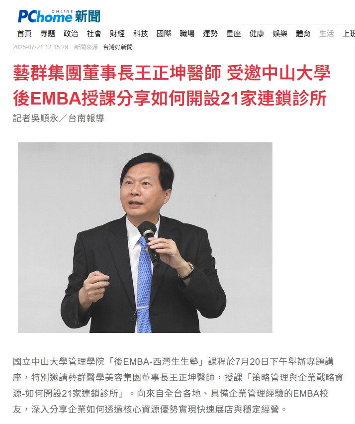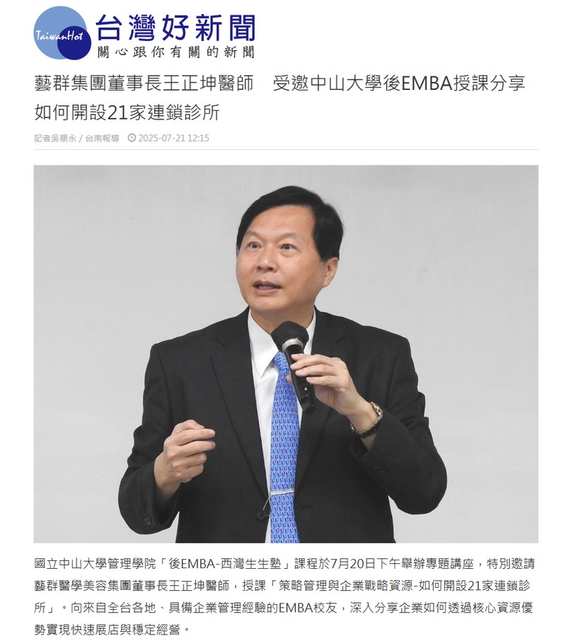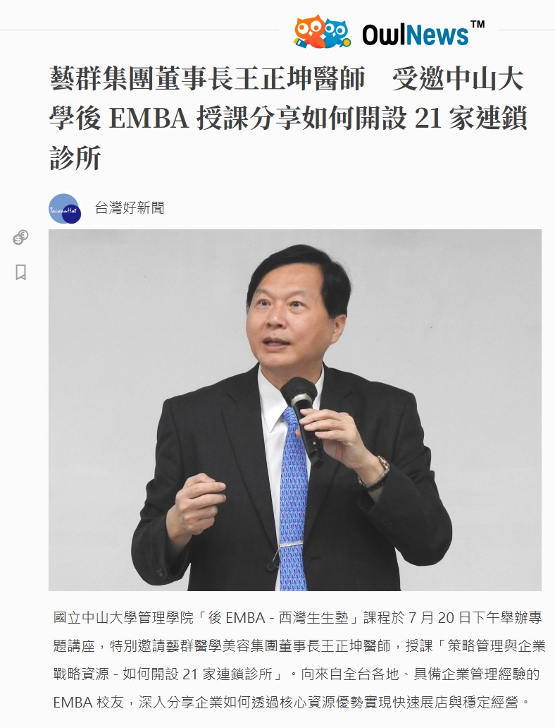 藝群集團董事長王正坤醫師 受邀中山大學後EMBA授課分享如何開設21家連鎖診所 -台灣好新聞-PChome新聞-TDN TODAY 善思新聞網-奧丁丁新聞-yamNews新聞