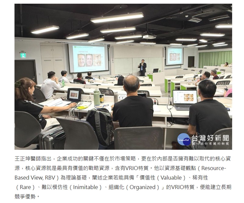 王正坤醫師指出,企業成功的關鍵不僅在於市場策略,更在於內部是否擁有難以取代的核心資源,核心資源就是最具有價值的戰略資源,含有VRIO特質。他以資源基礎觀點(Resource-Based View, RBV)為理論基礎,闡述企業若能具備「價值性(Valuable)、稀有性(Rare)、難以模仿性(Inimitable)、組織化(Organized)」的VRIO特質,便能建立長期競爭優勢。