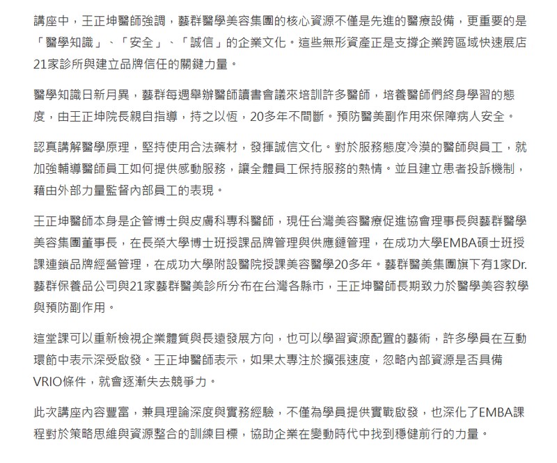講座中,王正坤醫師強調,藝群醫學美容集團的核心資源不僅是先進的醫療設備,更重要的是「醫學知識」、「安全」、「誠信」的企業文化。這些無形資產正是支撐企業跨區域快速展店21家診所與建立品牌信任的關鍵力量。