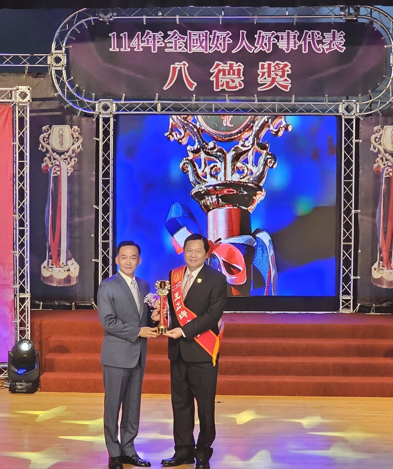 由中華民國表揚好人好事運動協會主辦的「114年全國好人好事代表八德獎頒獎典禮」,於12月10日在臺北市政府青年局舉行。王正坤醫師以長年深耕醫療公益、扶助弱勢及回饋教育的卓越事蹟,榮獲「八德獎」殊榮,成為全國醫界與企業界兼具的典範代表。