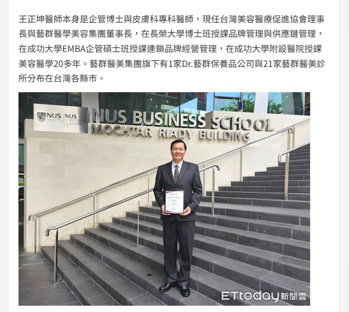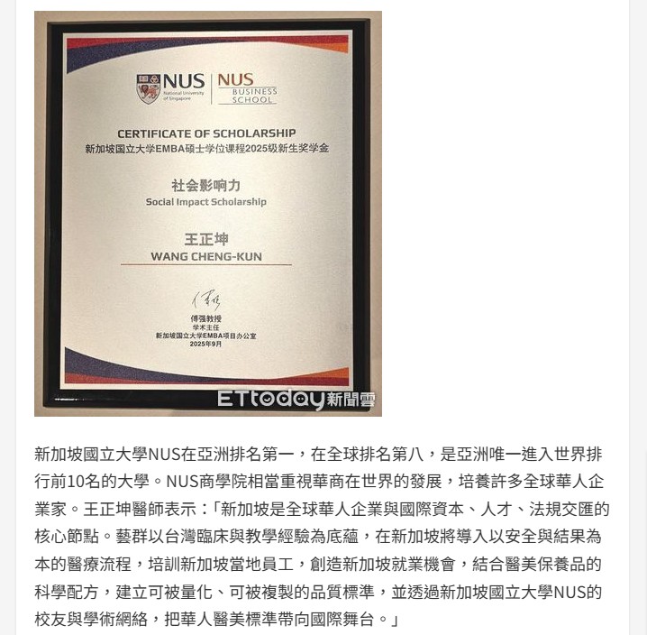 王正坤醫師獲NUS社會影響力獎學金 藝群醫美首站海外拓展新加坡 -東森新聞雲-ETtoday新聞雲