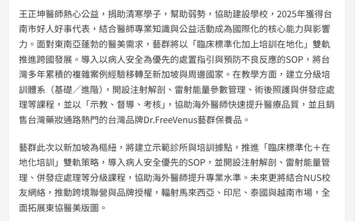 王正坤醫師熱心公益,捐助清寒學子,幫助弱勢,協助建設學校,2025年獲得台南市好人好事代表,結合醫師專業知識與公益活動成為國際化的核心能力與影響力。面對東南亞蓬勃的醫美需求,藝群將以「臨床標準化加上培訓在地化」雙軌推進跨國發展。導入以病人安全為優先的處置指引與預防不良反應的SOP,將台灣多年累積的複雜案例經驗移轉至新加坡與周邊國家。在教學方面,建立分級培訓體系(基礎/進階),開設注射解剖、雷射能量參數管理、術後照護與併發症處理等課程,並以「示教、督導、考核」,協助海外醫師快速提升醫療品質,並且銷售台灣藥妝通路熱門的台灣品牌Dr.FreeVenus藝群保養品。