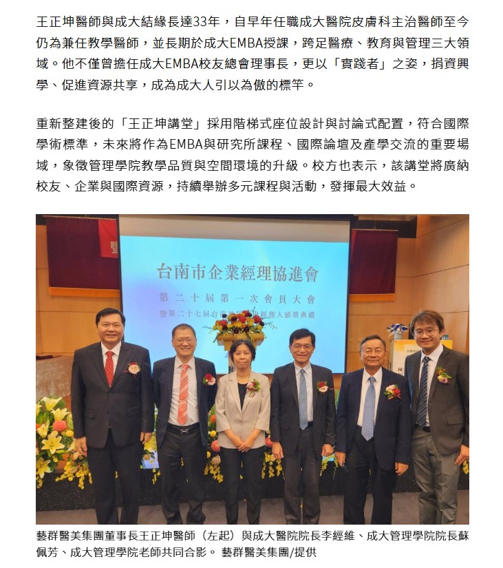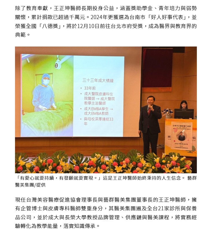 現任台灣美容醫療促進協會理事長與藝群醫美集團董事長的王正坤醫師,擁有企管博士與皮膚專科醫師雙重身分,其醫美集團遍及全台21家診所與保養品公司,並於成大與長榮大學教授品牌管理、供應鏈與醫美課程,將實務經驗轉化為教學能量,落實知識傳承。