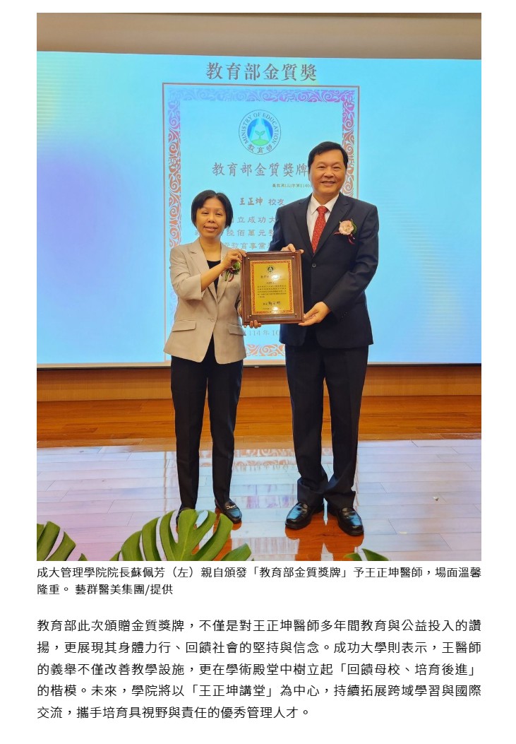 教育部此次頒贈金質獎牌,不僅是對王正坤醫師多年間教育與公益投入的讚揚,更展現其身體力行、回饋社會的堅持與信念。成功大學則表示,王醫師的義舉不僅改善教學設施,更在學術殿堂中樹立起「回饋母校、培育後進」的楷模。未來,學院將以「王正坤講堂」為中心,持續拓展跨域學習與國際交流,攜手培育具視野與責任的優秀管理人才。