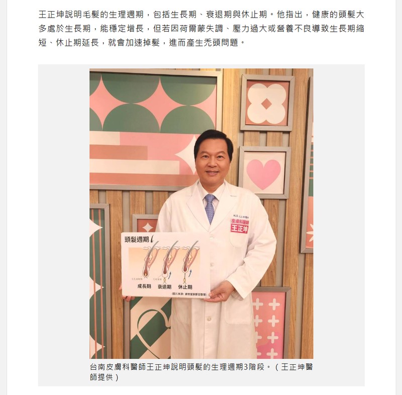 王正坤說明毛髮的生理週期,包括生長期、衰退期與休止期。他指出,健康的頭髮大多處於生長期,能穩定增長,但若因荷爾蒙失調、壓力過大或營養不良導致生長期縮短、休止期延長,就會加速掉髮,進而產生禿頭問題。